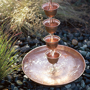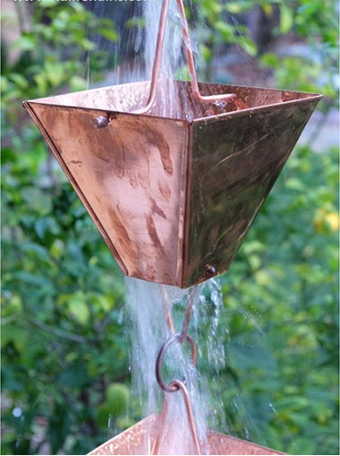 The standard downspouts only job is to effectively divert water away from your foundation, but do all homeowners find them aesthetically pleasing? Most likely not. Rain chains are a beautiful and a functional alternative to traditional, closed gutter downspouts. Guiding rainwater visibly down chains or cups from the roof to the ground, rain chains transform a plain gutter downspout into a pleasing water feature. From the soft tinkling of individual droplets to the soothing rush of white water, they are a treat to not only listen to but look at as well. Rain chains do exactly what downspouts do the rainwater swirls and flows down, creating a mesmerizing sense of motion and tranquility right outside your window. They are beautiful on dry days too, as over time; copper rain chains develop a rich blue-green patina. Rain or shine they would be a beautiful addition to any home or garden.