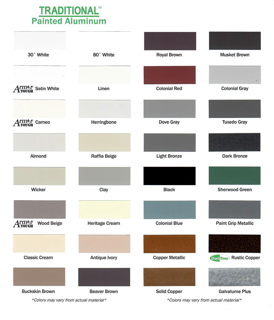 We carry a large variety of aluminum rain gutter colors. When choosing rain gutter colors, choose colors that will blend with your home. The seamless gutters and downspouts are available in more than 30 different colors, ideal for matching the trim on your or the exterior of your building. All the colors are baked on at the factory. Aluminum gutter colors are listed below. *Please note that the screen representation of the colors below may not represent the true color. Please make color selection at time of estimate to ensure proper color match. These images are to give you an idea of the colors offered.